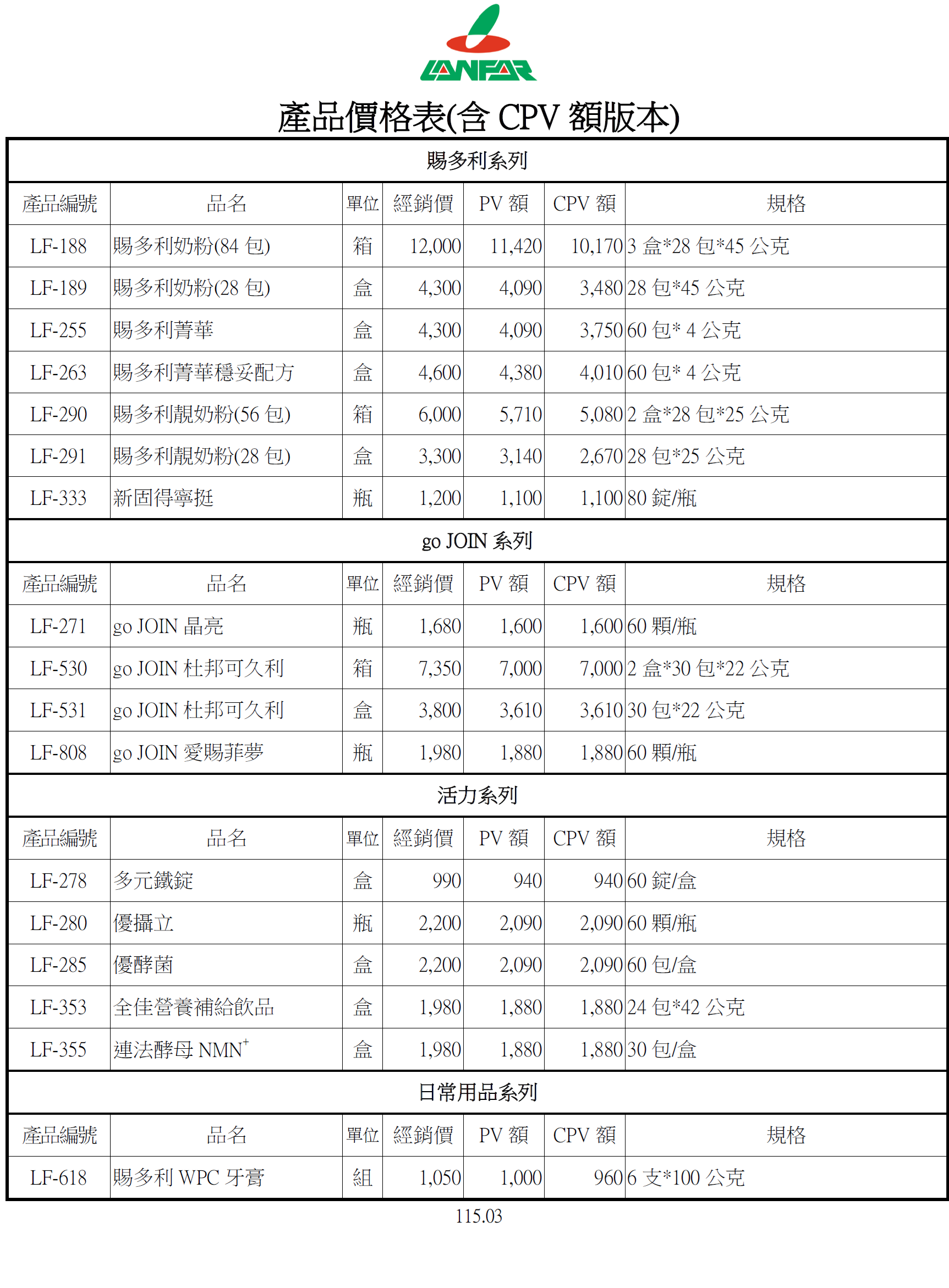 產品價格表